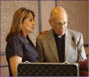 {Left to right} Serra Guest, JD Douglas, Monsignor Isidro Payan and {below} Interpreter Maria de Jesus (Chita) Douglas and Al Adkins listening through headset. |